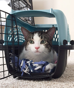 A few weeks ago,  Kerry found a cute little boy at Mary's Kitty Korner in Granby, CT.  He was a bit shy, but she got good vibes from him, and he was also adorable!  She filled out paperwork to apply for adoption and had to wait almost a week for them to check her references and give her the green light to adopt.